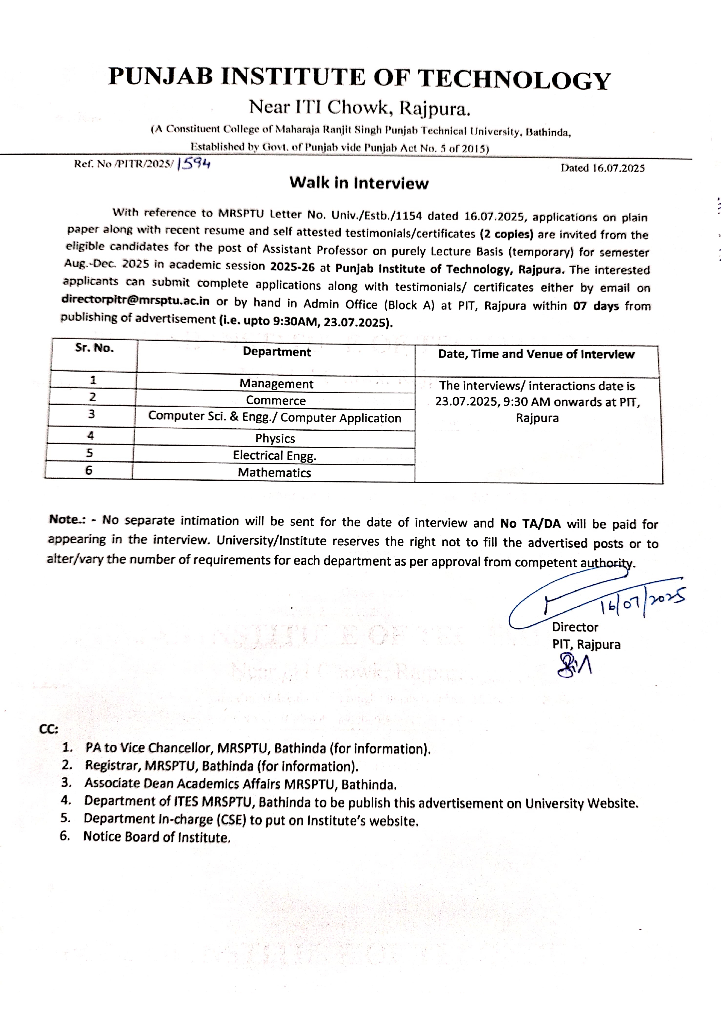 Advertisement of Requirement of Lecture Basis Faculty for August December 2025 (Walk-In)